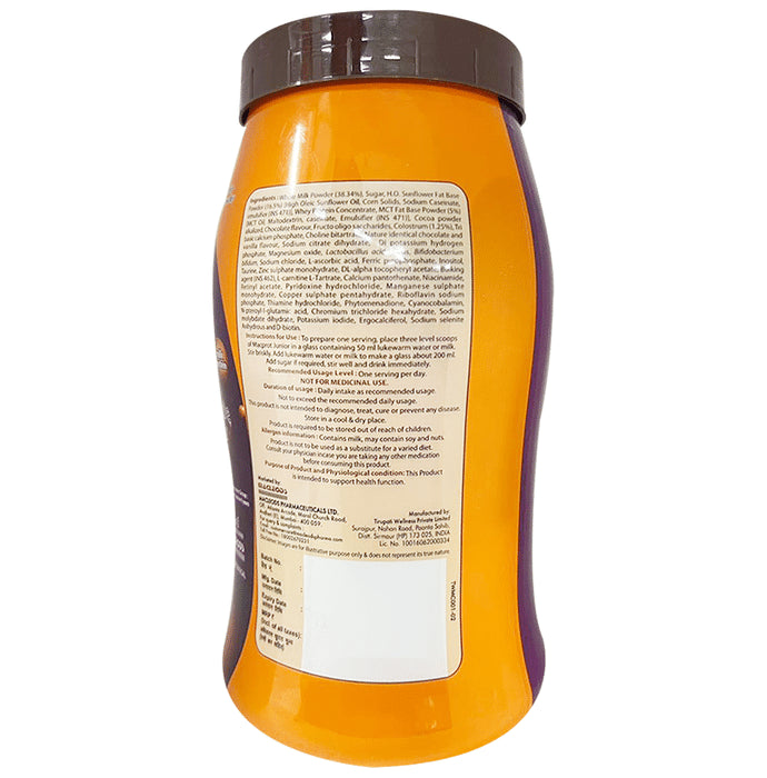 Composition : Whole Milk Powder, Sugar, High Oleic Sunflower Oil Powder, Whey Protein Concentrate, MCT Fat Base Powder, Alkalized Cocoa Powder, Fructooligosaccharides, Colostrum, Tribasic Calcium Phosphate, Choline Bitartrate, Cream Plus, Sodium Citrate Dihydrate, Dipotassium Hydrogen Phosphate, magnesium Oxide, Lactobacillus Acidophilus, Bifidobacterium bifidum, Sodium Chloride, L-Ascorbic Acid, Ferric Pyrophosphate, Inositol, Taurine, Zinc Sulphate, Monohydrate, DL-Alpha Tocopheryl Acetate, Ethyl Cellulose (INS 462), L-Carnitine L-Tartrate, Calcium D Pantothenate, Niacinamide, Retinyl Acetate, Pyridoxine HCl, Manganese Sulphate Monohydrate, Riboflavin Sodium Phosphate, Copper Sulfate Pentahydrate, Thiamine HCl, Phytomenadione, Cyanocobalamin, N-Pteroyl-L-Glutamic Acid, Chromium Trichloride, Hexahydrate, Sodium Molybdate Dihydrate, Potassium Iodide, Sodium Selenite Anhydrous, Biotin, Argocalciferol