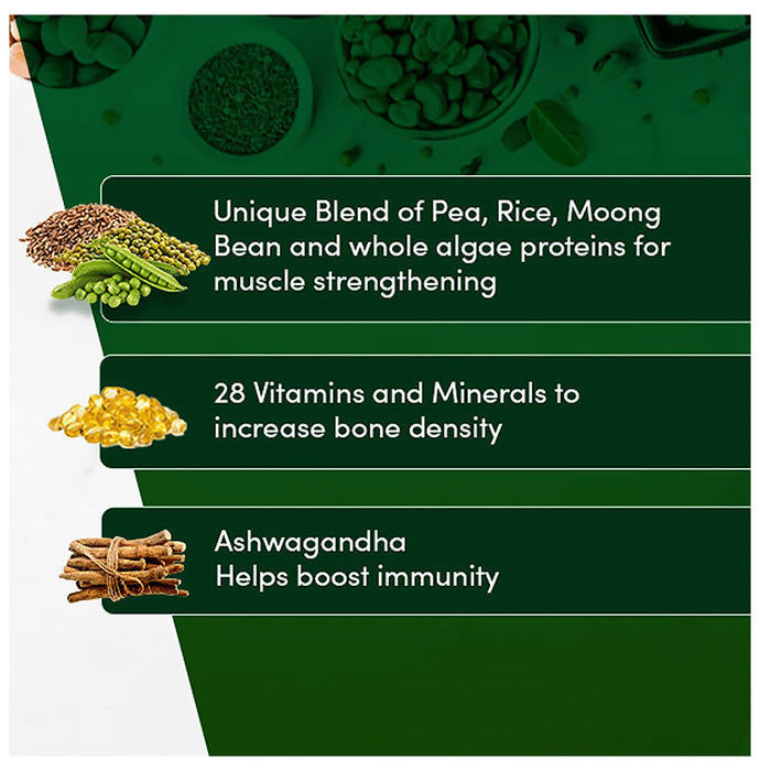Composition : Pea blend,Rice,Moong bean,Whole algae,Essential vitamins and minerals,Ashwagandha