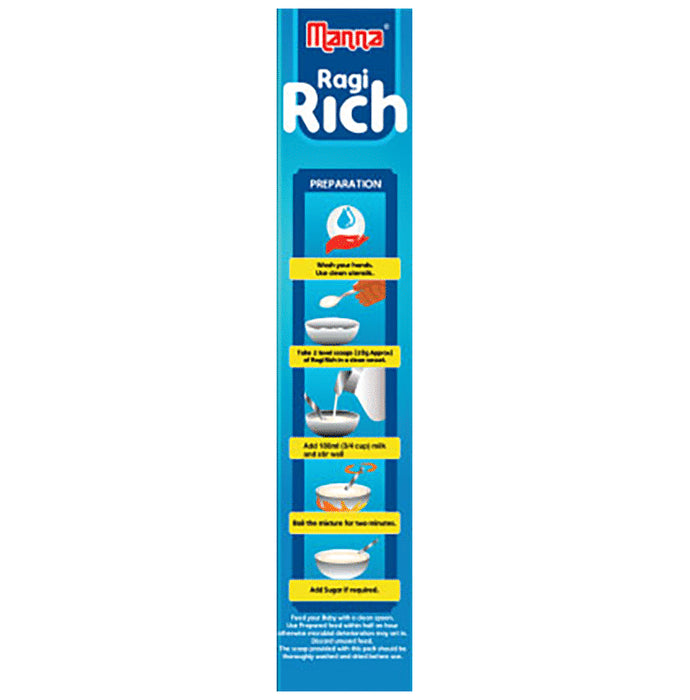 Manna Ragi Rich Baby Food with Sprouted Grains 6+ Months is a nutritious meal to help your little one grow. It contains many essential nutrients that are necessary for the development of the bones, muscles and joints of children. It is also is easy to digest and does not put a strain on the tummy of your child.