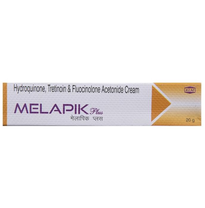 Melapik Plus Cream is a prescription medicine having a combination of medicines that is used to treat melasma. It helps in quick skin renewal. It provides relief from redness, swelling and itching. Melapik Plus Cream should be used in the dose and duration as advised by your doctor. Wash your hands before using this medicine. It is advised to check the label for directions before use. It is for external use only.Do not use this medicine more than the recommended dose. Inform your doctor if you have known allergies from this medicine. The common side effects of this medicine include burning, irritation, itching and redness at the application site, acne, and dry mouth.If these side effects or any other symptoms which you think are because of this medicine persist for a longer duration, please consult your doctor. Inform your doctor if you are pregnant or are suffering from any other disease. This medicine is not safe to use in breastfeeding mothers.
