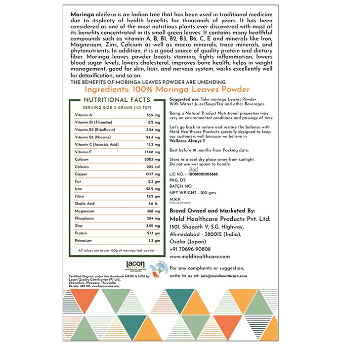 Meld wellness always 100% Organic Moringa Leaf is a superfood and an ideal companion for any health routine. It contains many healthful compounds such as vitamins A, B, B1, B2, B3, B6, C, and E and minerals like iron, magnesium, zinc, calcium, macro minerals, trace minerals, and phytonutrients. Additionally, it is a better source of quality protein and dietary fibre. Moringa leaves powder boosts stamina, fights inflammation, lowers blood glucose levels, lowers cholesterol and improves bone health. It also aids in weight management, is beneficial for skin, hair and the nervous system, and works excellently for detoxification. Meld organic moringa leaf powder is easy to consume with any beverage, like soup, juice, tea, coffee, curry, hot water, and milkshake.