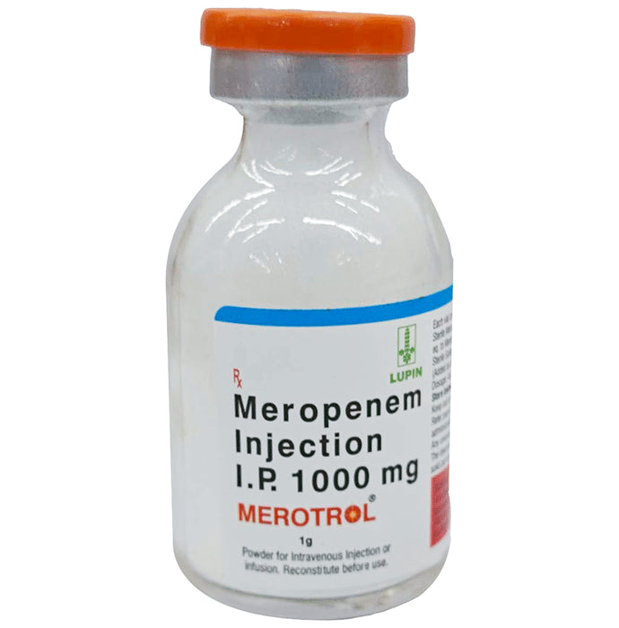 Merotrol 1g Injection is an antibiotic that is used to treat severe infections of the skin, lungs, stomach, urinary tract, blood, and brain (eg. meningitis). It works by killing the bacteria that cause these problems. However, it will not treat a viral infection. Merotrol 1g Injection is commonly used to treat critically ill patients admitted to the hospital. This medicine is given by drip/infusion or by direct injection into a vein, under the supervision of a doctor or a nurse. The dose will depend on what type of infection you have, where it is in the body, and how serious it is. You should keep on taking the injection for as long as you have been prescribed, even if your symptoms quickly improve. If you stop taking it too early the infection may return or worsen.Some people may develop side effects like headache, nausea, constipation, diarrhea, anemia, vomiting, and rash. These side effects are usually temporary and go away as your body adjusts to the medicine. Consult your doctor if these side effects bother you or do not go away. Before starting treatment with this medicine, you should tell your doctor if you have epilepsy (seizures), liver or kidney problems or if you are allergic to any antibiotic. While using it, you may be advised blood tests to monitor your blood cell count and kidney function. This medicine is generally regarded as safe to use in pregnancy and breastfeeding if prescribed by the doctor.