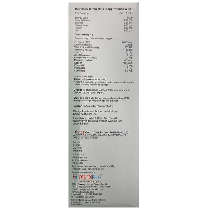 Composition : Lycopene,Methylcobalamin,Vitamin A,Vitamin C,Vitamin E,Zinc,Vitamins B1, B2, B6,Copper