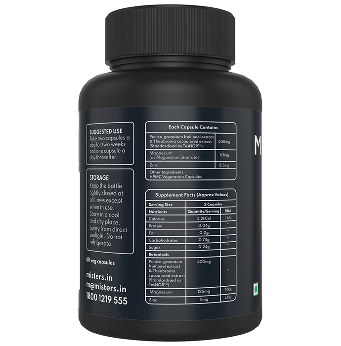 Composition : Ashwagandha,Punica granatum fruit peel extract,Theobroma cacao seed extract,Magnesium,Zinc,HPMC Vegetarian capsules