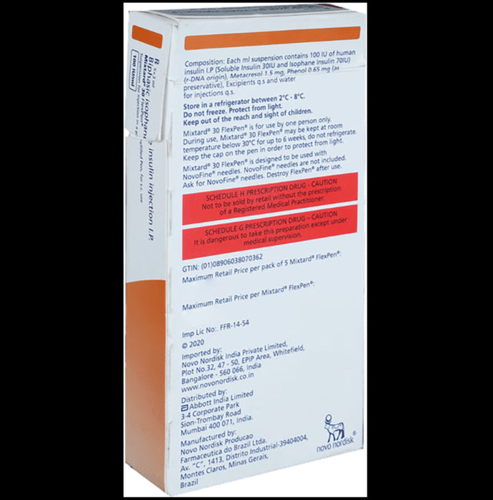 Mixtard 30 Flexpen (3ml Each) is a combination of two medicines, an intermediate-acting and a short-acting type of insulin. It is used in the treatment of diabetes mellitus (type 1 and 2) to improve blood sugar control both in adults and children. It helps maintain the blood sugar levels in diabetic patients. Mixtard 30 Flexpen (3ml Each) is a combination of two types of insulin used in the treatment of type 2 diabetes mellitus. Together, they ensure rapid and consistent sugar control. It prevents long-term complications of high sugar level on your organs and blood vessels. This medicine should be used with regular exercise and a healthy diet for best results. Monitor your blood sugar regularly as it may cause hypoglycemia (low blood sugar level) as a side effect.