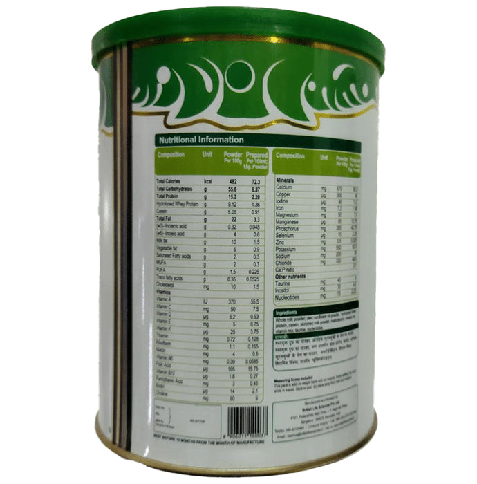 Composition : Maltodextrin, Whole milk powder, High Oleic sunflower oil powder (HOSO), Coconut database powder, Hydrolysed whey protein, Skimmed milk powder, Fruclsoigasacchaides(FDS), Galactooligosaccharides (GOS), Human milk oligosaccharides (2?-Fucosyllactose), Mineral mix, Arachidonic Acid (ARA), Docosahexaenoic Acid (DHA), Vitamin Mix, Nucleotides, Lactoferrin and Lactic Acid bacillus