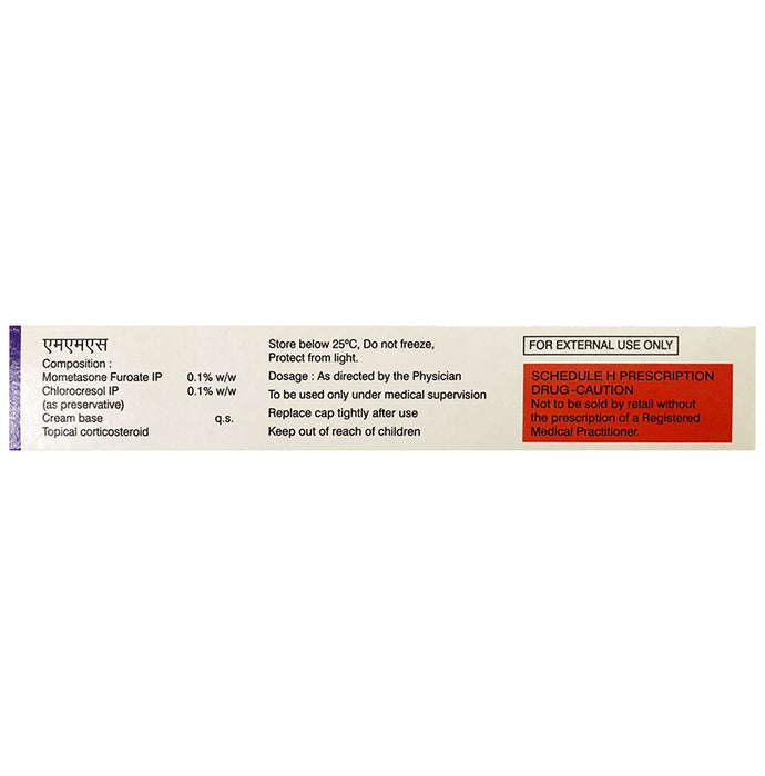 MMS Cream is a steroid that is used to treat certain skin conditions such as eczema, psoriasis, dermatitis, and rash. It helps reduce symptoms like swelling, itching, and redness.You should always use MMS Cream exactly as your doctor has told you. Do not use the cream or ointment for more than the recommended duration. Spread it as a thin layer onto the skin. Do not cover the area being treated with a bandage or plaster unless your doctor tells you to. You should use this medicine regularly but do not apply large amounts or use it for longer than prescribed. Tell your doctor if your condition does not improve after 2 weeks of treatment.MMS Cream has a few potential side effects but not everyone will get them. These include inflammation and infection of hair follicle and burning, stinging, and itching senstation at the time of application. Let your doctor know in case you re worried or bothered by these side effects.Let your doctor know about any medical issues you have such as thinning of the skin, any skin infection, broken or ulcerated skin, diabetes, and immune system problems. Also, inform the doctor about other medicines you are taking (particularly steroids). Pregnant or breastfeeding women should consult their doctor before using this medicine.