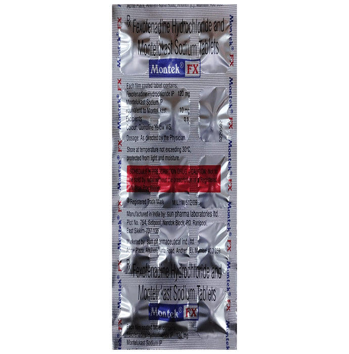 Montek FX Tablet is a combination medicine used in the treatment of allergy symptoms such as runny nose, stuffy nose, sneezing, watery eyes, and congestion or stuffiness. Montek FX Tablet is taken with or without food in a dose and duration as advised by the doctor. The dose you are given will depend on your condition and how you respond to the medicine. You should keep taking this medicine for as long as your doctor recommends. If you stop treatment too early your symptoms may come back and your condition may worsen. Let your healthcare team know about all other medications you are taking as some may affect, or be affected by this medicine.The most common side effects include nausea, diarrhea, vomiting, skin rash, flu-like symptoms, and headache. Most of these are temporary and usually resolve with time. Contact your doctor straight away if you are at all concerned about any of these side effects. This medicine may cause dizziness and sleepiness, so do not drive or do anything that requires mental focus until you know how this medicine affects you. Avoid drinking alcohol while taking this medicine as it can worsen your sleepiness.Never support self-medication or recommend your medicine to another person. It is beneficial to have plenty of fluids while taking this medication. Before you start taking this medicine it is important to inform your doctor if you are suffering from liver or kidney disease. You should also tell your doctor if you are pregnant, planning pregnancy or breastfeeding.