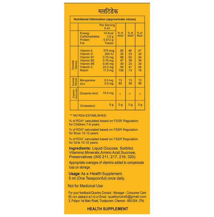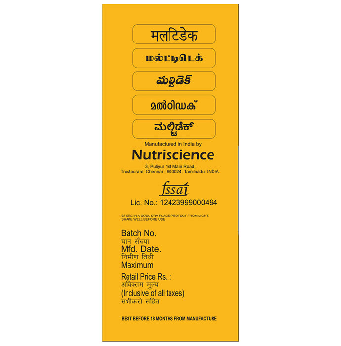 Multidec Syrup is a comprehensive health supplement containing vitamin B12 for managing symptoms associated with anaemia and neuropathies, and folic acid for deficiency. It also includes beta carotene, an antioxidant protecting against UV radiation and free radicals. Beneficial for hair and skin, it serves as a general health supplement to maintain overall well-being, providing protection against cell damage and supporting the management of vitamin A deficiency.