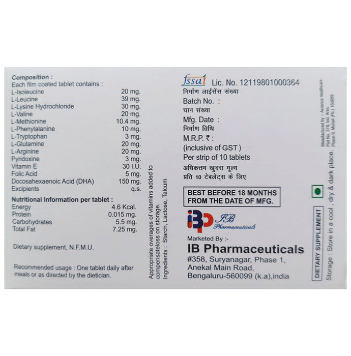 Composition : L-isoluecine,L-leucine,L-lysine hydrochloride,L-valine,L-methioinine,L-phenylalanine,L-glutamine,L-arginine,Pyridoxine,Vitamin E,Folic acid,Docosahexaenoic acid (DHA),Excipients