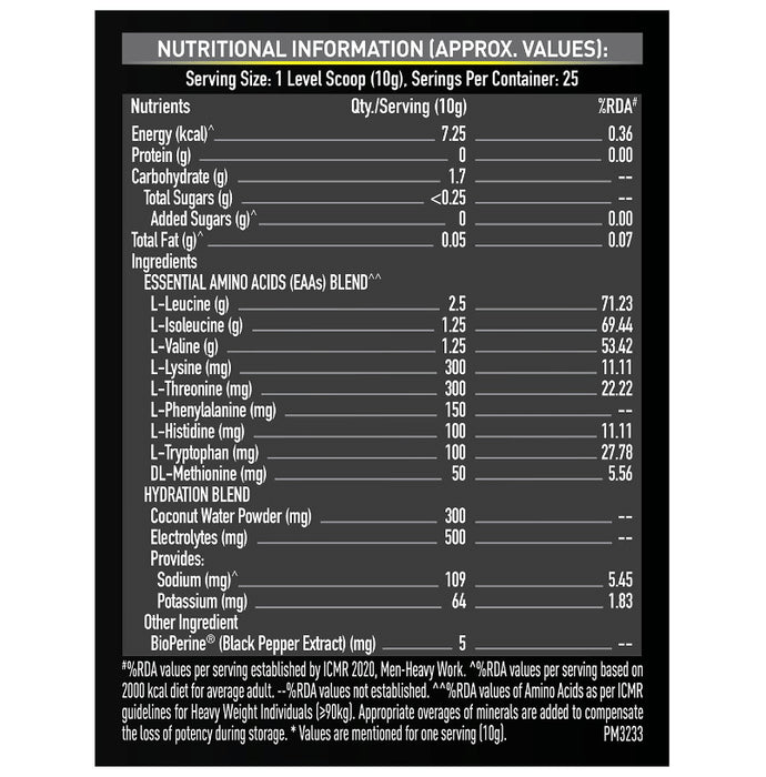 Composition : Branched Chain Amino Acids Powder (L-Leucine, L-Isoleucine and L-Valine), Acidity Regulator (INS 330), Nature Identical Flavouring Substance, Orange Fruit Powder, L-Lysine HCI, L- Threonine, Coconut Water Powder, Natural Flavouring Substances, Trisodium Citrate Anhydrous, Natural Food Colour (INS 160 a (in)), L-Phenylalanine, Sodium Chloride, Potassium Chloride, L-Histidine HCI, Sweetener (INS 955), L-Tryptophan, DL-Methionine, Anti-Foaming Agent (900a) and BioPerine? (Black Pepper Extract)