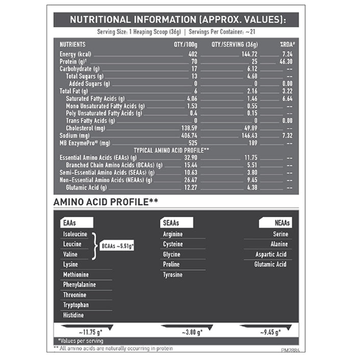 Composition : Whey Protein Concentrate, Whey Powder, Cocoa Powder, Nature-Identical Flavouring Substance, Emulsifier(INS 322(i)), Sodium Chloride, MB Enzyme Pro®, Stabilizers (INS 415 and INS 1101 (iii)), Sweetener (INS 955) and Anticaking Agent (INS 551). MB Enzyme Pro® [Proteases]-A unique patent pending and clinically studied Enhanced Absorption Formula [EAF®]