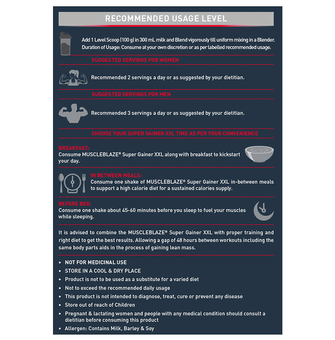 MuscleBlaze MB Super Gainer XXL Powder with Shaker is a sports nutrition supplement rich in calories and may help in muscle mass gain. It contains a blend of protein and simple and complex carbs to fuel muscles for faster recovery and enhanced protein synthesis. It delivers 22.5gm proteins per 100gm of serving with milk. You can get 462 kcal per serving to fuel you for longer. This powder contains 27 vital vitamins and minerals to support workout performance and boost immunity. The added digestive enzymes and dietary fibre can enhance the overall experience. The product comes with a shaker bottle of 650ml capacity with a blender ball. It is made from safe, durable, and BPA-free plastic. The mixing ball ensures lump-free protein and BCAAs supplement shakes.
