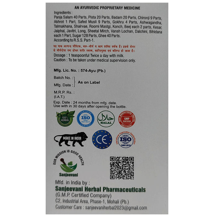 Composition : Panja salam 40 parts, Pista 20 parts, Badam 20 parts, Chironji 9 parts, Akhrot 1 part, Safed musli 9 parts, Gokhru 4 parts, Ashwagandha, Talmakhana, Shalrvae, Roomi mastagi, Konch Beej each 2 parts, Kesar, Jaiphal, Javitri, Long, Sheetal mirch, Vansh lochan, Dalchini, Bihidana each 1 part, Sugar 128 parts, Ghee 40 parts.