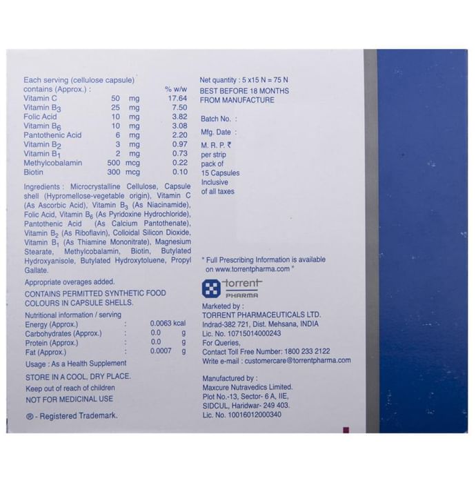 Composition : Vitamins C, B3, B6, B2, B1, Methylcobalamin, Folic acid, Biotin