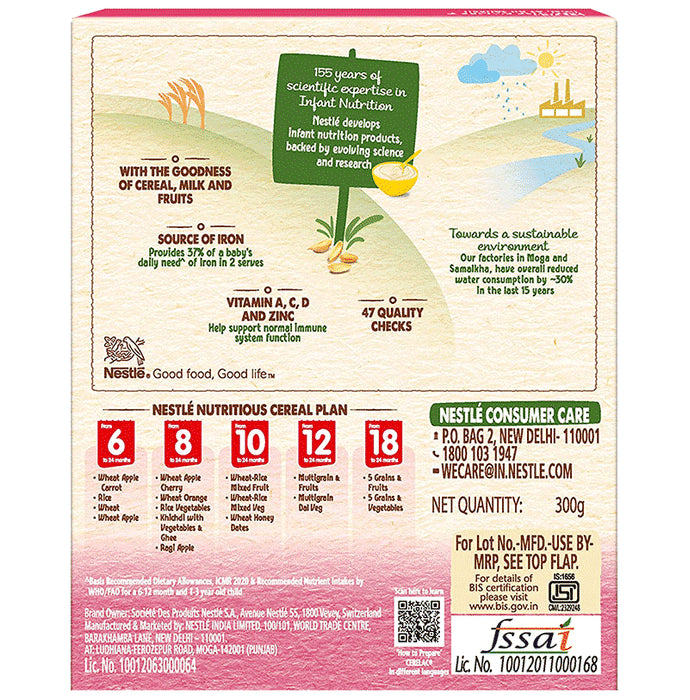 Nestle Cerelac Baby Cereal with Milk, Wheat-Rice Mixed fruits 10 Months+ Nestle Cerelac Baby Cereal with Milk is a complementary baby food for infants from 10 to 24 months. While infants and children have higher requirements of nutrients than adults, 2 servings of Cerelac Wheat - Rice Mixed Fruit Cereal provide 37% of a baby’s daily need^ of iron. It is also a source of 14 important nutrients including vitamins and minerals. Vitamins A, C, D, and Zinc help support normal immune system function. This baby cereal is rich in protein and packed with the goodness of cereal, milk, and fruits. With 155 years of scientific expertise in infant nutrition, Nestle develops infant nutrition products backed by evolving science and research. Innovation has been at the heart of Nestle since its beginning.
