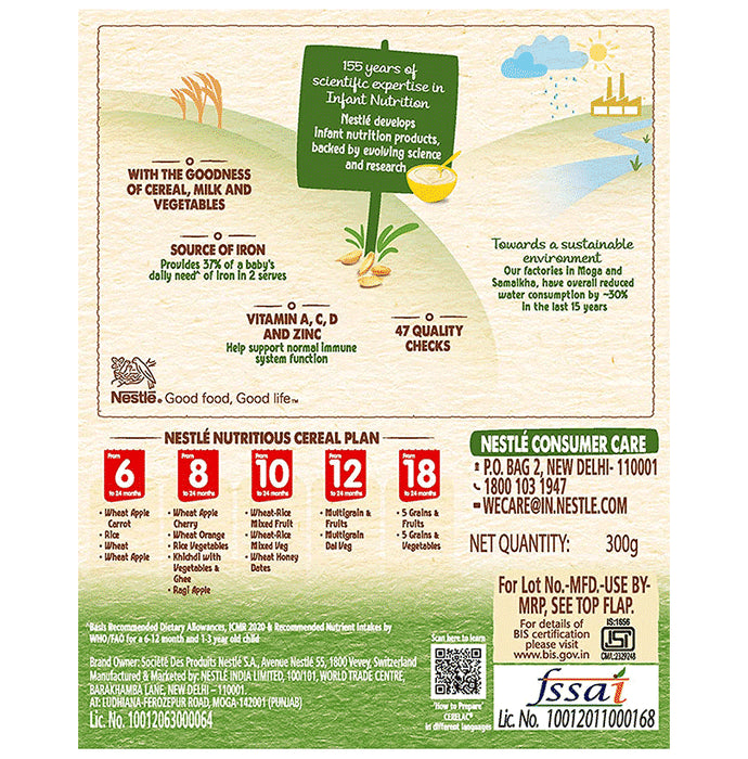 Nestle Cerelac Baby Cereal with Milk, Wheat-Rice Mixed Veg 10 Months+Nestle Cerelac Baby Cereal with Milk is a complementary baby food for infants from 10 to 24 months. While infants and children have higher requirements of nutrients than adults, 2 serves of Cerelac Wheat - Rice Mixed Veg Cereal provide 37% of a baby’s daily need^ of iron. It is also a source of 14 important nutrients including vitamins and minerals. Vitamin A, C, D, and Zinc help support normal immune system function. This baby cereal is rich in protein and packed with the goodness of cereal, milk, and vegetables. With 155 years of scientific expertise in infant nutrition, Nestle develops infant nutrition products backed by evolving science and research. Innovation has been at the heart of Nestle since its beginning.
