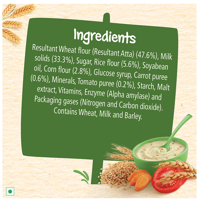 Composition : Resultant Wheat flour (Resultant Atta) (47.6%), Milk solids (33.3%), Sugar, Rice flour (5.6%), Soyabean oil, Corn flour (2.8%), Glucose syrup, Carrot puree (0.6%), Minerals, Tomato puree (0.2%), Starch, Malt extract, Vitamins, Enzyme (Alpha amylase) and Packaging gases (Nitrogen and Carbon dioxide),Contains Wheat, Milk and Barley.