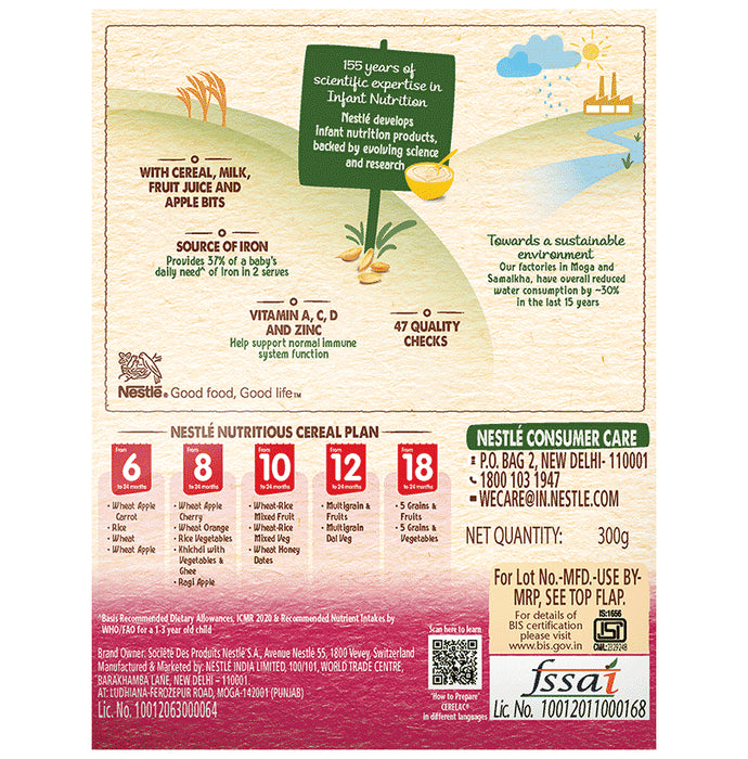 Nestle Cerelac Baby Cereal with Milk from 12 to 24 Months Multigrain & FruitsNestlé Cerelac Baby Cereal with Milk is a complementary baby food for infants from 12 to 24 months. While infants and children have higher requirements of nutrients than adults, 2 serves of Cerelac Multigrain & Fruits Cereal provide 37% of a baby’s daily need^ of iron. It is also a source of 14 important nutrients including vitamins and minerals. Vitamin A, C, D, and Zinc help support normal immune system function. This baby cereal is rich in protein and packed with the goodness of cereal, milk, and fruits. With 155 years of scientific expertise in infant nutrition, Nestlé develops infant nutrition products backed by evolving science and research. Innovation has been at the heart of Nestlé since its beginning.