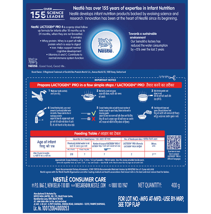 Nestlé LACTOGEN Pro 4, Follow-up Formula Powder, After 18 Months Up to 24 Months, Bag-In-Box PackNestlé LACTOGEN Pro 4 baby milk powder is a spray-dried follow-up formula for infants after 18 months up to 24 months when they are not breastfed. It contains Iron that helps support normal cognitive development. It also has vitamins such as Vitamins A, C & D and whey protein for normal immune system functioning. With a legacy spanning over 155 years, Nestlé brings its expertise in infant nutrition backed by science and research. STORAGE CONDITIONS: Transfer the contents from the baby milk powder box along with the pouch in an airtight container. Important Notice: Mother's milk is best for your baby.