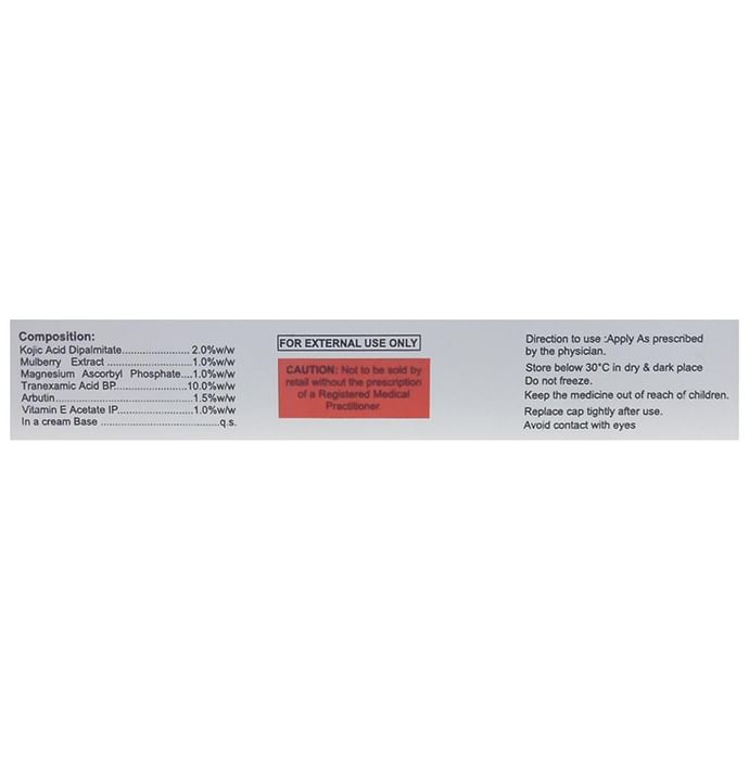 Composition : Tranexamic Acid (10% w/w) + Kojic Acid (2% w/w) + Arbutin (1.5% w/w) + Magnesium (1% w/w) + Vitamin E (1% w/w) + Mulberry extract (1% w/w)