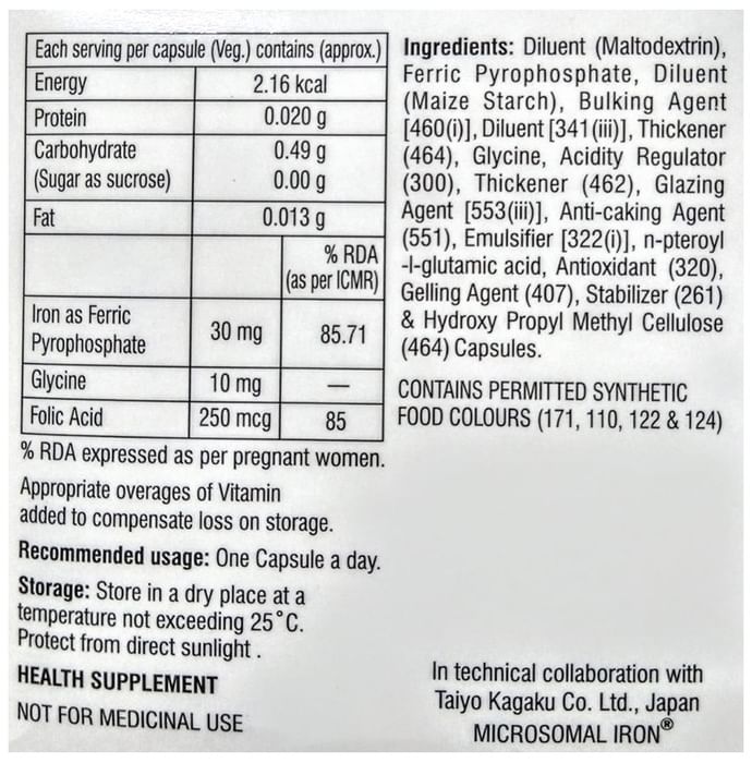 Composition : Iron(Ferrric Pyrophosphate), Folic Acid, Glycine, Diluent (Maltodextrin), Diluent(Maize Starch), Bulking Agent, Diluent, Thickener, Acidity Regulator, Glazing Agent, Ant-caking Agent, Emulsifier, N-Pteroyl Glutamic Acid, Antioxidant, Gelling Agent, Stabiliser, Hydroxy Propyl Methyl Cellulose Capsules
