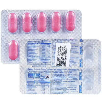 Newbona Frac Tabletis a medicine used for joint and bone health (as well as various feminine disorders and menopause), and it also promotes bone growth rate and strengthens the bones as well. Ingredients: Calcium Citrate|Vitamin D3|Cissus quadrangularis Benefits: Improves the rate of healing in bones|Boosts bone strength and improves respiratory conditions|Increases fracture recovery rate|Assists in controlling weight Direction of use: Take Newbona Frac Tabet as directed by the physician. Uses: Builds calcium and makes bones stronger|Increases the blood count|Relieves the body pains