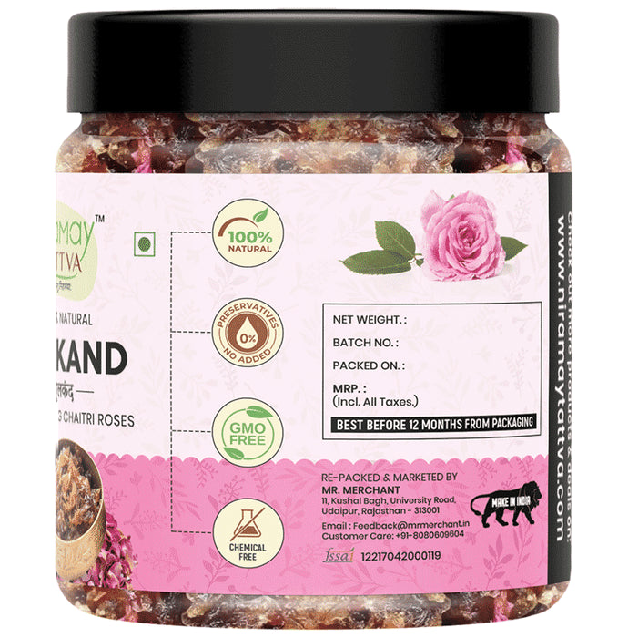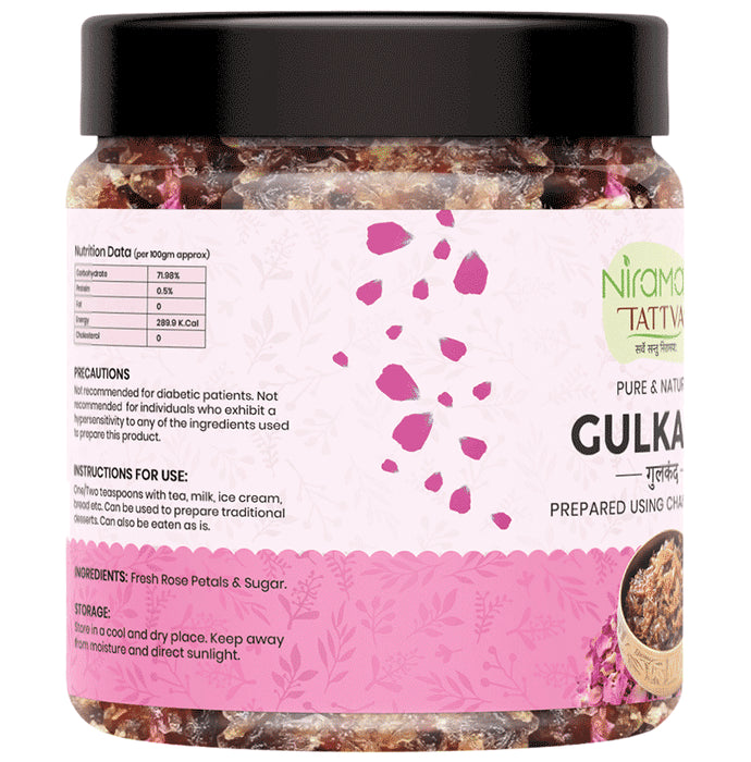 Niramay Tattva Gulkand is a delicacy crafted from high-quality pink Indian rose petals sourced from the picturesque HaldiGhati in Rajasthan, sun-cooked to perfection. Unlike traditional boiling methods, sun cooking retains delicate flavour compounds present in rose petals, ensuring an authentic experience. This ancient Indian digestive tonic acts as a natural cooling agent, aiding digestion, improving appetite, and alleviating heat-related issues like fatigue and mental stress. Made from Chaitri roses, this Gulkand is rich in antioxidants, serving as a rejuvenator for skin, hair, and overall physical health. Enjoy its delightful sweetness and aroma by mixing it in milk as a rose sherbet or savouring it on its own.