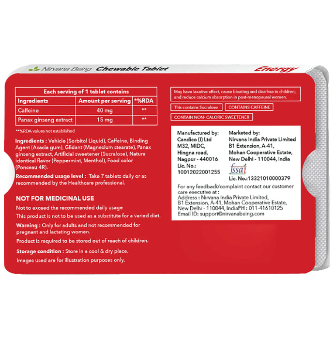 Nirvana Being Energy Tablet (15 Each) Sugar Free is a specially formulated supplement designed to provide a natural energy boost, enhance stamina, and support overall mental well-being. Each tablet is crafted with precision to address the modern lifestyle's demands, ensuring that you stay healthy and energized throughout the day.