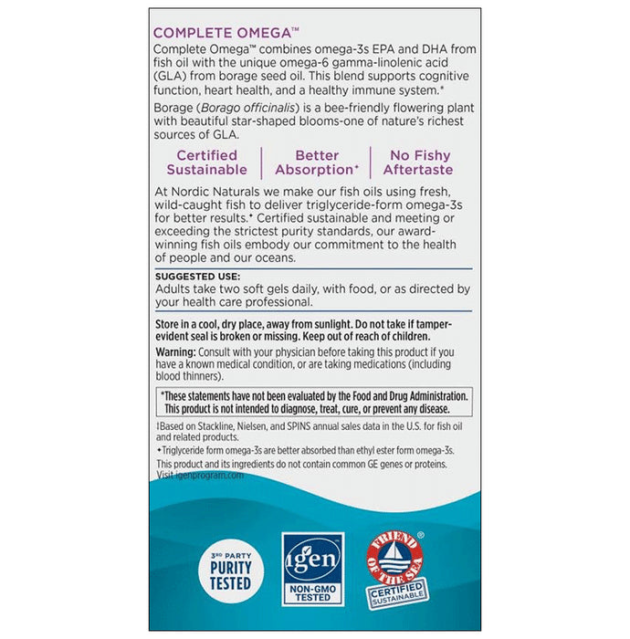 Nordic Naturals Complete Omega 565mg Omega 3 + 70mg GLA Soft Gel Complete Omega 3 supplement combines omega-3s EPA and DHA from fish oil with the unique omega 6 gamma-linolenic acid (GLA) and omega 9 Oleic Acid from borage seed oil. The perfect balanced combination of omegas 3, 6, and 9 nourishes skin, promotes a healthy mind and supports joint health. It is effective for both the brain and the skin. Borage (borago officinalis) is a bee-friendly flowering plant with beautiful star-shaped blooms and is one of nature's richest sources of GLA. This formula combines pure, fresh omega-3 fish oil with sustainably sourced borage oil. Every batch of Nordic Naturals fish oils is tested by a third-party certified lab for environmental toxins, including heavy metals. All fish oils omega 3 capsules are in the triglyceride form and surpass the strictest international standards for purity and freshness.