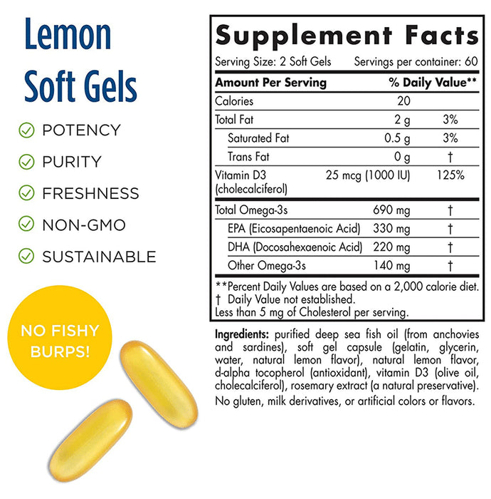 Nordic Naturals Omega-3D 690mg Softgel Lemon is a better and more effective omega-3 supplement that provides heart, brain, bone and immune support. It is non-GMO and tested for purity.