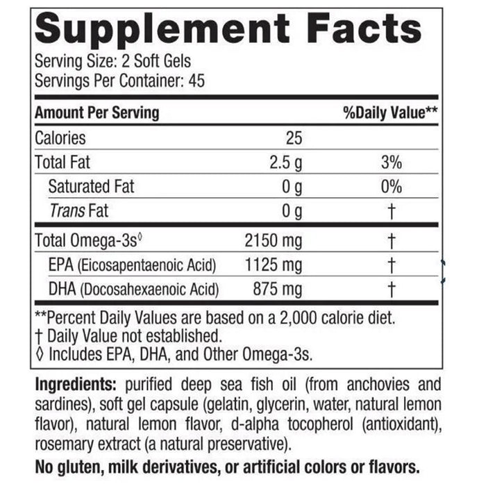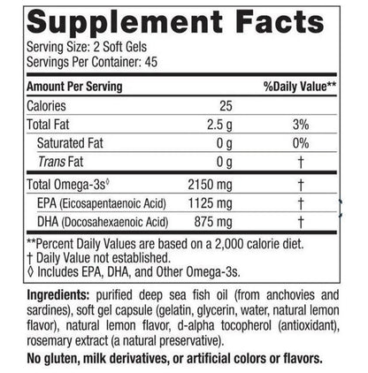 Composition : Purified deep sea fish oil (from anchovies and sardines), soft gel capsule (gelatin, glycerin, water, natural lemon flavour), natural lemon flavor, d-alpha-tocopherol (antioxidant), rosemary extract (a natural preservative)
