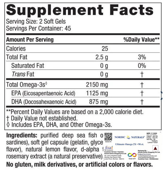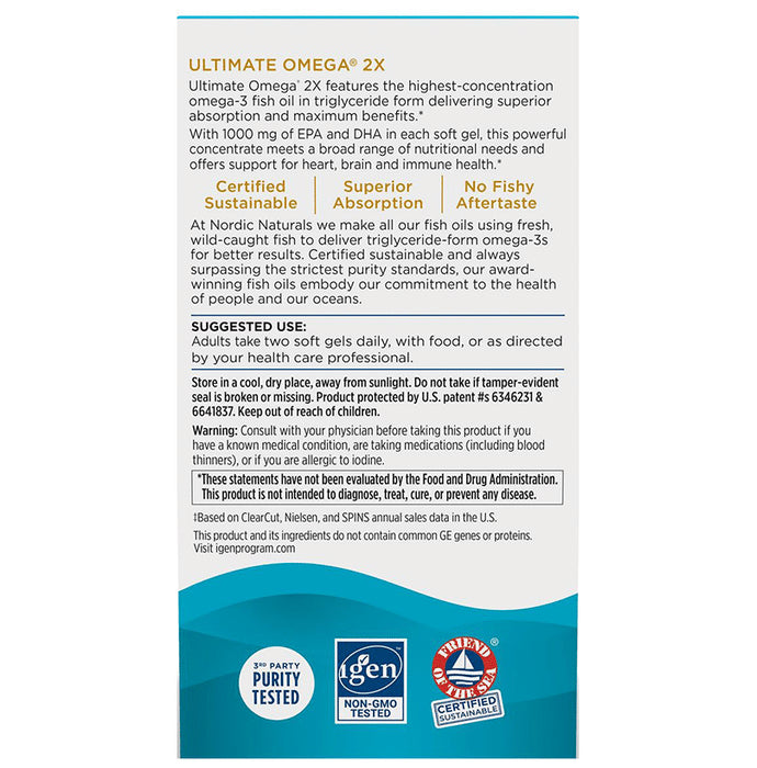Nordic Naturals Ultimate Omega 2X Ultimate Omega 2X features the highest-concentration omega-3 fish oil in triglyceride form (the form naturally found in fish), delivering superior absorption and maximum benefits. With 1000 mg of EPA and DHA in each soft gel, this powerful concentrate meets a broad range of nutritional needs. Ultimate Omega 2X offers support for heart, brain and joint health and is ideal for anyone looking for omega-3s in their most bioavailable form.