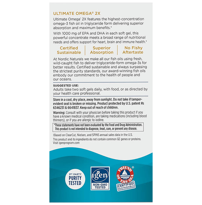 Nordic Naturals Ultimate Omega 3 2x 2150mg Soft Gel Nordic Naturals’ most powerful omega-3 concentrate - for those who want the strongest support in every serving. Ideal for individuals needing the highest levels of omega-3s EPA and DHA, for immunity, heart and brain health, and for those whose doctors prescribe 2000+ mg of omega-3s daily. Made from 100% wild-caught sardines and anchovies. All Nordic Naturals fish oil products are offered in the triglyceride molecular form—the form naturally found in fish and the form your body most easily absorbs. Everything Nordic Naturals make is non-GMO and third-party tested, surpassing the strictest international standards for purity and freshness. Nordic Naturals fish oils are Friend of the Sea (FOS) certified and sustainably made in a zero-waste facility powered by biofuel.