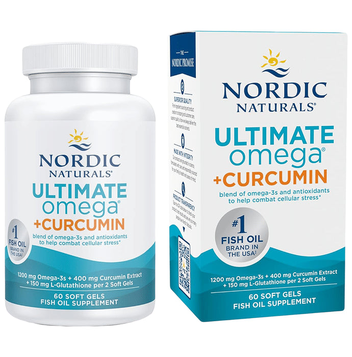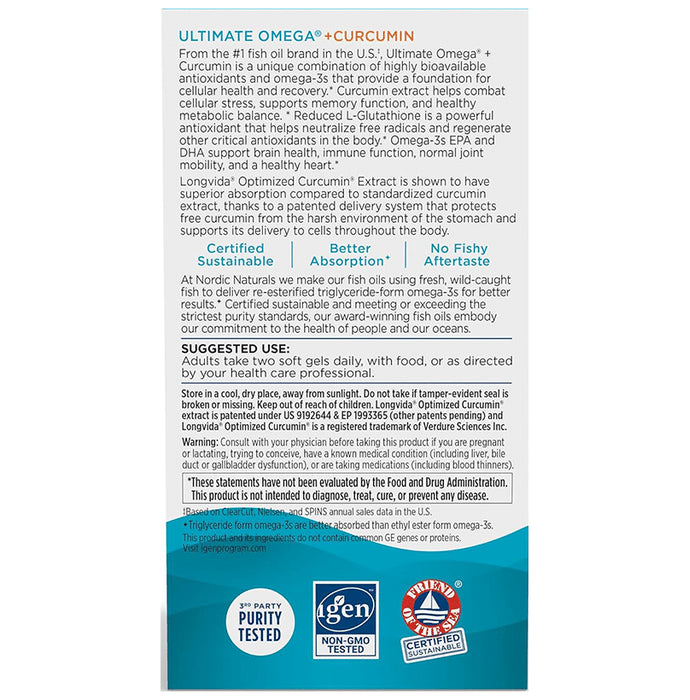 Nordic Naturals Ultimate Omega + Curcumin Softgel Give yourself cellular-level protection with Nordic Naturals Omega Curcumin Supplement. Each serving of omega-3 fish oil and curcumin delivers 1,000 mg of total omega-3s as well as 400 mg of longvida(R) optimised curcumin extract and 150 mg reduced L-glutathione supplement. A unique blend of fish oil omega 3 plus curcumin (from turmeric) and potent antioxidants. All Nordic Naturals fish oil products are offered in the triglyceride molecular form—the form naturally found in fish and the form your body most easily absorbs. Every product is non-GMO and third-party tested, surpassing the strictest international standards for purity and freshness. Nordic Naturals fish oils are Friend of the Sea (FOS) certified and sustainably made in a zero-waste facility powered by biofuel.