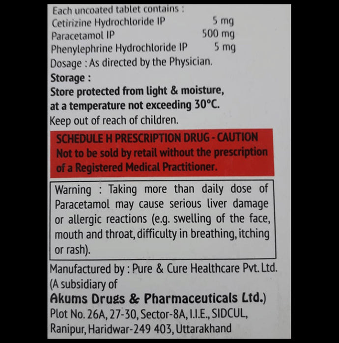 Composition : Cetirizine (5mg) + Paracetamol (500mg) + Phenylephrine (5mg)