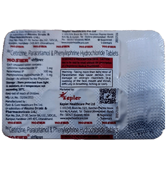 Nosier Tablet is used in the treatment of common cold symptoms like runny nose, stuffy nose, sneezing, watery eyes, and congestion or stuffiness. It is also used to relieve pain and fever. Nosier Tablet is taken with or without food in a dose and duration as advised by the doctor. The dose you are given will depend on your condition and how you respond to the medicine. You should keep taking this medicine for as long as your doctor recommends. If you stop treatment too early your symptoms may come back and your condition may worsen. Let your doctor know about all other medications you are taking as some may affect, or be affected by this medicine.The most common side effects are nausea, vomiting, headache, fatigue, dryness in the mouth, and allergic reaction. Most of these are temporary and usually resolve with time. Contact your doctor straight away if you are at all concerned about any of these side effects. This medicine can also cause sleepiness, so do not drive or do anything that requires mental focus until you know how this medicine affects you. Avoid drinking alcohol while taking this medicine as it can worsen your sleepiness.Never support self-medication or recommend your medicine to another person. It is beneficial to have plenty of fluids while taking this medication. Before taking this medicine, you should tell your doctor if you have any kidney or liver diseases so that your doctor can prescribe a suitable dose for you. You should also tell your doctor if you are pregnant, planning pregnancy, or breastfeeding.