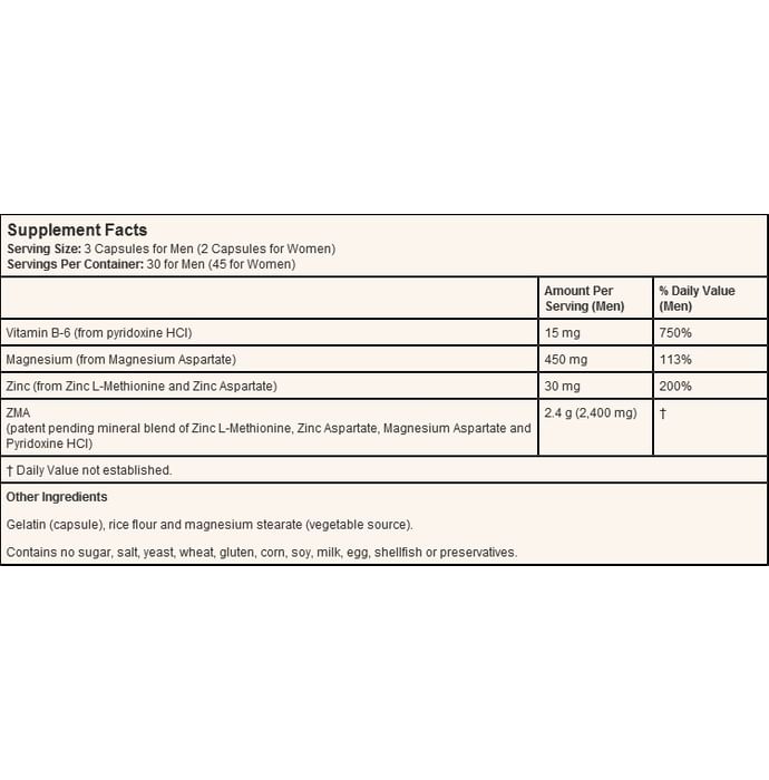 NOW Sports ZMA Capsule is a synergistic combination of zinc and magnesium designed to maximize absorption and promote recovery from exercise. Zinc plays a central role in the regulation of cellular growth and tissue repair, as well as the maintenance of a healthy immune system. Magnesium is essential for the maintenance of electrolyte balance, energy production and normal neuromuscular function. Because physical activity can increase the need for these two minerals, zma is the ideal supplement to aid in their replenishment.