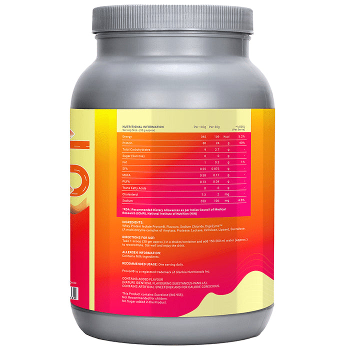 Composition : Whey Protein Isolate Provon,Flavours,Sodium Chloride,DigeZyme (A multi-enzyme complex of Amylase, Protease, Lactase, Cellulase, Lipase),Sucralose (INS 955)