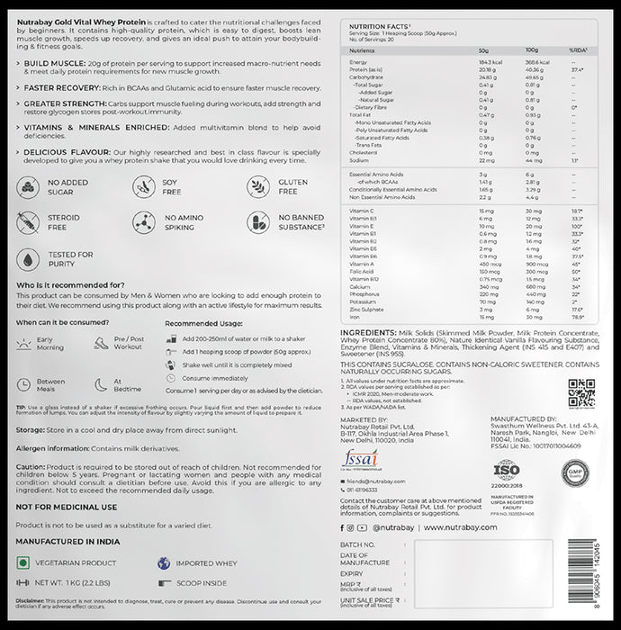 Nutrabay Gold Vital Whey Protein Powder is crafted to cater for the nutritional challenges faced by beginners. It contains high-quality protein, which is easy to digest, boosts lean muscle growth, speeds up recovery, and gives an ideal push to attain your bodybuilding and fitness goals. It is a scientifically formulated whey protein formula containing fast-digesting protein with carbs designed to promote muscle recovery and provide an extra energy boost. Added vitamins and minerals support better metabolism and immune health. Anyone can take this whey protein, especially beginners or gym-goers that prefer having some carbs with proteins. It delivers 20 grams of protein per serving from easily digestible whey protein concentrate, milk protein concentrate, and milk solids.