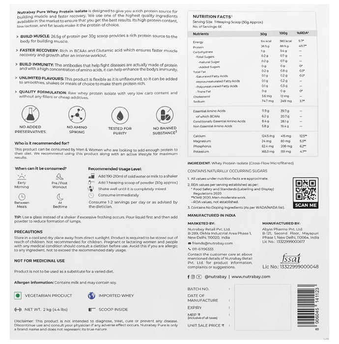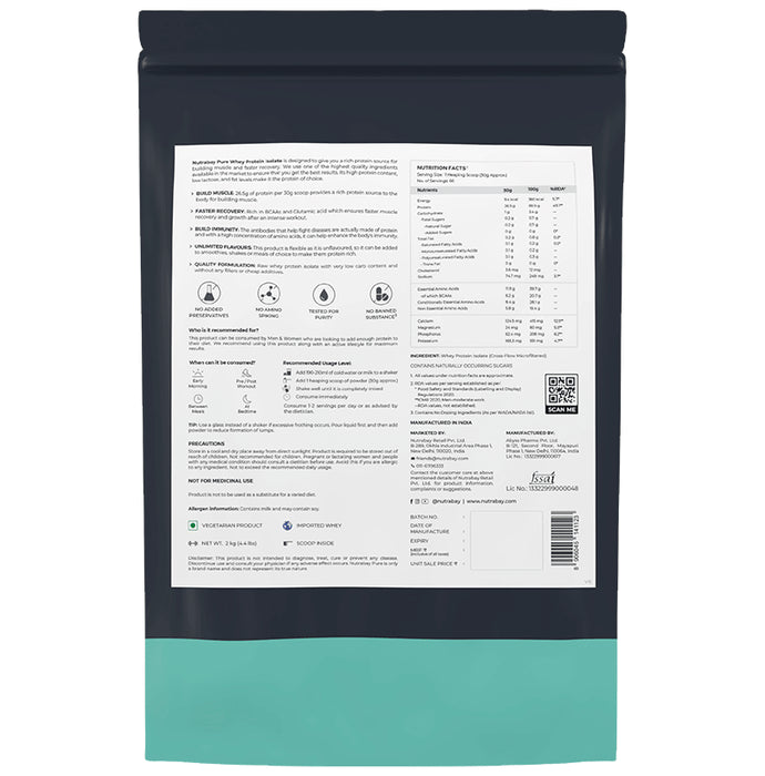 Nutrabay Pure Isolate Whey Protein Unflavoured is designed to give one a rich protein source for building muscle and promoting faster recovery. One of the highest quality ingredients available in the market has been used to ensure the best results. It's high protein content, low lactose, and fat levels make it the protein of choice.