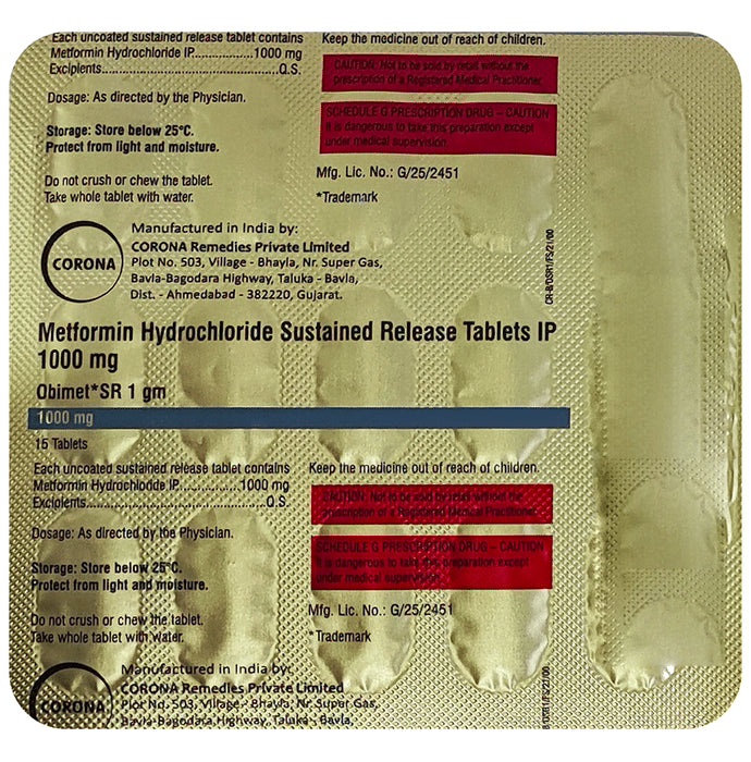 Obimet SR 1gm Tablet is a medicine used to treat type 2 diabetes mellitus. It helps control blood sugar levels and thus prevent serious complications of diabetes. It is also used to treat a menstruation-related disorder known as Polycystic ovary syndrome (PCOS) in women. Obimet SR 1gm Tablet is best taken with food to avoid nausea and abdominal pain. You should take it regularly, at the same time each day, to get the most benefit. You should not stop taking this medicine unless your doctor recommends it. Your lifestyle plays a big part in controlling diabetes. Therefore, it is important to stay on the diet and exercise program recommended by your doctor while taking this medicine. The most common side effects of this medicine include diarrhea, nausea, vomiting, flatulence, weakness, indigestion, abdominal discomfort, headache, and loss of appetite. Some people may develop hypoglycemia (low blood sugar level) when this medicine is taken along with other antidiabetic medicines, alcohol, or upon skipping a meal. Monitor your blood sugar levels regularly while taking it.Before taking this medicine, inform your doctor if you have any kidney, liver, or heart problems. Pregnant or breastfeeding women should also consult their doctor before taking it. Your doctor will check your kidney function tests before starting treatment with it. Avoid excessive alcohol intake while taking it as this may increase the risk of developing some side effects.