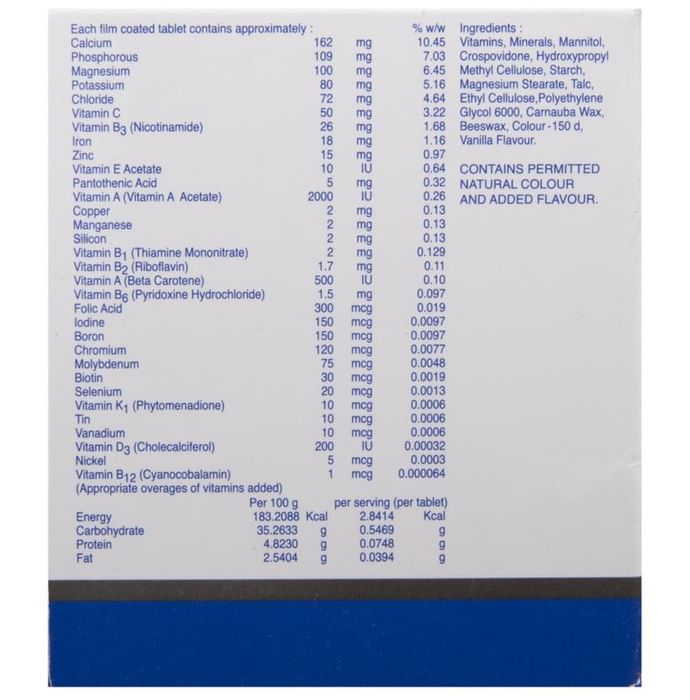 Composition : Beta-carotene,Calcium pantothenate,Chloride,Copper sulphate,Cyanocobalamin,Elemental boron,Elemental calcium,Elemental iron,Heavy magnesium oxide IP,Manganese sulphate - equivalent to elemental manganese,Folic Acid,Vitamin A,Vitamin C,Vitamin D3,Vitamin E,Niacinamide,Zinc oxide - equivalent to elemental zinc,Cupric oxide - equivalent to elemental copper,Thiamine mononitrate,Riboflavin,Pyridoxine HCL,Folic acid,Chromium picolinate - equivalent to elemental chromium,Biotin,Selenious acid - equivalent to elemental selenium,Methylcobalamin,L-glutamic acid,DL-methionine