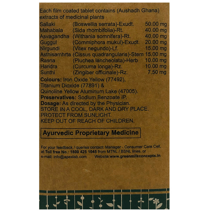 Composition : Sallaki (Boswellus serrata)-Exudt, Manabala (Sida rhombifolia) R Asvagandha (Withania somnifera), Guggul (Commiphora mukul)-Exudt., Ningundi (Vitex negundo)-Lf., Asthisamhita (Cissus quadrangularis)-Stem, Rasna (Pluchea lanceolata)-Herti, Handra(Curcuma longa)-Rz, Sunthi (Zingiber officinale)-Rz