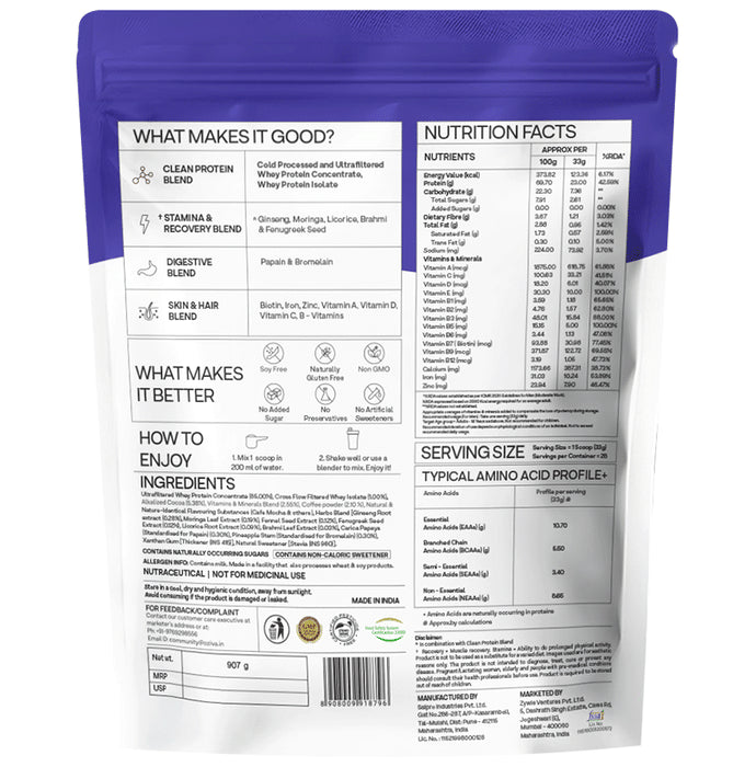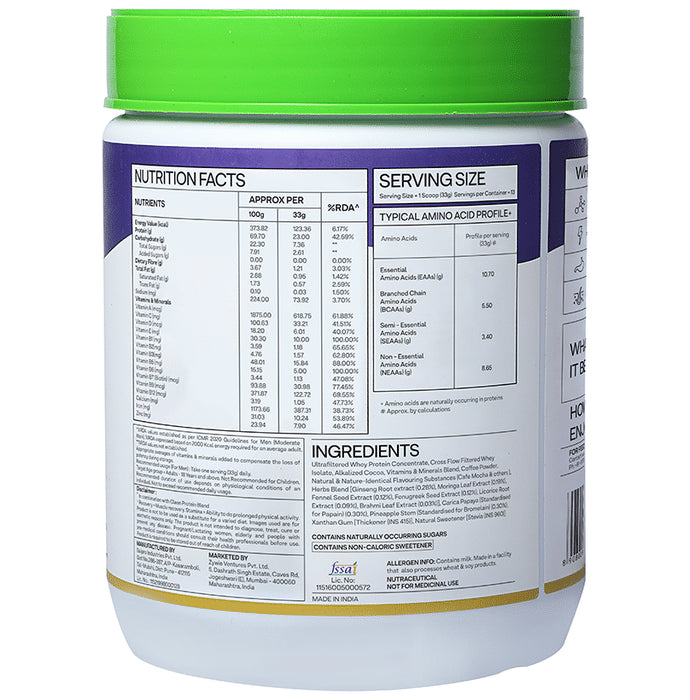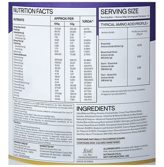 Composition : Ultrafiltered Whey Protein Concentrate, Cross Flow Filtered Whey Isolate, Alkalized Cocoa, Vitamins & Minerals Blend, Coffee Powder. Natural & Nature-Identical Flavouring Substances (Cafe Mocha & others). Herbs Blend [Ginseng Root extract (0.28%), Moringa Leaf Extract (0.19%) Fennel Seed Extract (0.12%), Fenugreek Seed Extract (0.12%), Licorice Root Extract (0.09%), Brahmi Leaf Extract (0.03%), Carica Papaya (Standardised for Papain) (0.30%), Pineapple Stem (Standardised for Bromelain) (0.30%). Xanthan Gum [Thickener (INS 415)], Natural Sweetener [Stevia (INS 960]