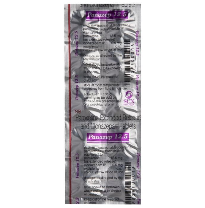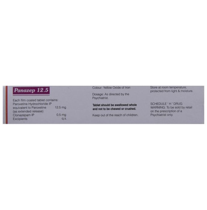 Panazep 12.5 Tablet ER is a prescription medicine used to treat depression. It is a combination medicine which works by increasing the level of chemical messengers in the brain that improves mood. It also calms the brain by decreasing the abnormal and excessive activity of the nerve cells. Panazep 12.5 Tablet ER can be taken with or without food. It is advised to take it at a fixed time each day to maintain a consistent level of medicine in the blood. Take this medicine in the dose and duration advised by your doctor as it has habit-forming potential. Try to never skip any doses, but if you miss a dose of this medicine, take it as soon as you remember. Finish the full course of treatment even if you feel better. It is important not to stop taking this medicine suddenly as it may result in withdrawal symptoms.Some common side effects of this medicine include nausea, vomiting, confusion, memory impairment, low sexual desire, confusion, and delayed ejaculation. It may cause dizziness and sleepiness. So, do not drive or do anything that requires mental focus until you know how this medicine affects you. It is important to inform your doctor if you develop any unusual changes in mood or depression as this medicine may cause suicidal thoughts.Take caution while taking medicine if you are suffering from liver disease. Your doctor should also know about all other medicines you are taking as many of these may make this medicine less effective or change the way it works. Inform your doctor if you are pregnant, planning pregnancy or breastfeeding.