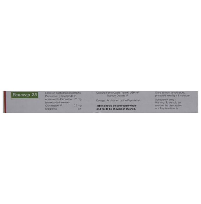 Panazep 25 Tablet ER is a prescription medicine used to treat depression. It is a combination medicine which works by increasing the level of chemical messengers in the brain that improves mood. It also calms the brain by decreasing the abnormal and excessive activity of the nerve cells. Panazep 25 Tablet ER can be taken with or without food. It is advised to take it at a fixed time each day to maintain a consistent level of medicine in the blood. Take this medicine in the dose and duration advised by your doctor as it has habit-forming potential. Try to never skip any doses, but if you miss a dose of this medicine, take it as soon as you remember. Finish the full course of treatment even if you feel better. It is important not to stop taking this medicine suddenly as it may result in withdrawal symptoms.Some common side effects of this medicine include nausea, vomiting, confusion, memory impairment, low sexual desire, confusion, and delayed ejaculation. It may cause dizziness and sleepiness. So, do not drive or do anything that requires mental focus until you know how this medicine affects you. It is important to inform your doctor if you develop any unusual changes in mood or depression as this medicine may cause suicidal thoughts.Take caution while taking medicine if you are suffering from liver disease. Your doctor should also know about all other medicines you are taking as many of these may make this medicine less effective or change the way it works. Inform your doctor if you are pregnant, planning pregnancy or breastfeeding.