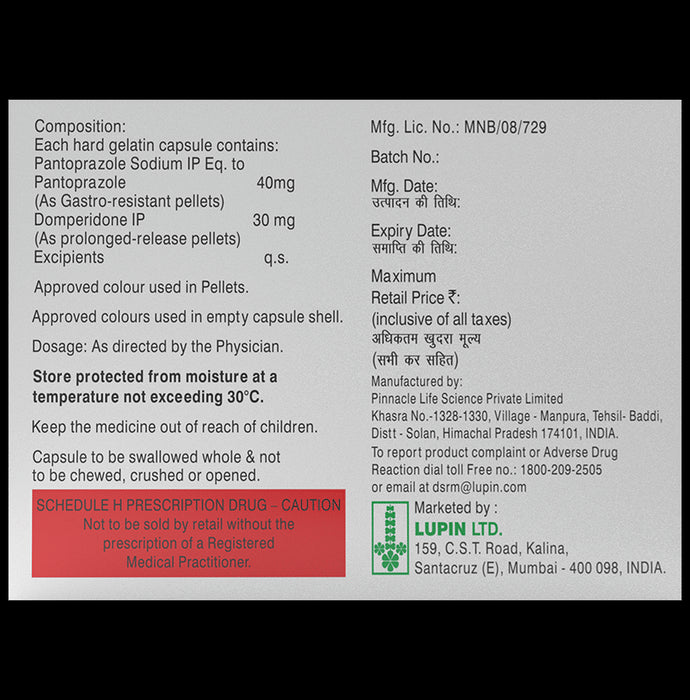 Composition : Domperidone (30mg) + Pantoprazole (40mg)