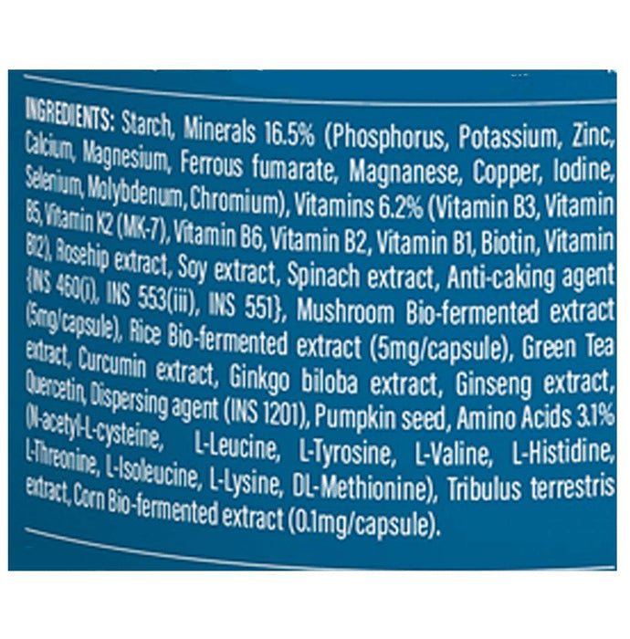 Composition : Minerals 16.5% (Phosphorus, Potassium, Zinc, Calcium, Magnesium, Ferrous Fumarate, Manganese, Copper, Iodine, Selenium, Molybdenum, Chromium), Vitamins  (vitamin B3, Vitamin B5, Vitamin K2 (mk-7), Vitamin B6, Vitamin B2, Vitamin B1, Biotin, Vitamin B12), Rose Hips Extract, Soy Extract, Spinach Extract, Anti-caking Agent, Shiitake Mushroom Bio-fermented Extract (5mg/capsule)rice Bio-fermented Ext. Powder 5mg, Mushroom Bio-fermented Ext. Powder 5mg, Quercetin Powder 5mg, Green Tea Ext. Powder 5mg, Ginkgo Biloba Ext. Powder 5mg, Ginseng Ext. Powder 5mg, Pumpkin Seed Ext. Powder 3mg, Tribus Ext. Powder 3mg, Corn Bio-fermented Ext. Powder 0.1mg, Mineral Blend And Vitamin Blend, Starch, Dispersing Agent, Amino acids  (N-acetyl-L-cysteine, L-Leucine, L-Tyrosine, L-Valine, L-Histidine, L-Threonine, L-Isoleucine, L-lysine, DL-Methionine), Tribulus terrestris extract