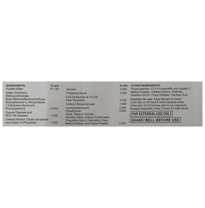 Composition : Zinc Oxide IP, Octinoxate USP, Oxybenzone USP, Octocrylene USP, Avobenzone USP